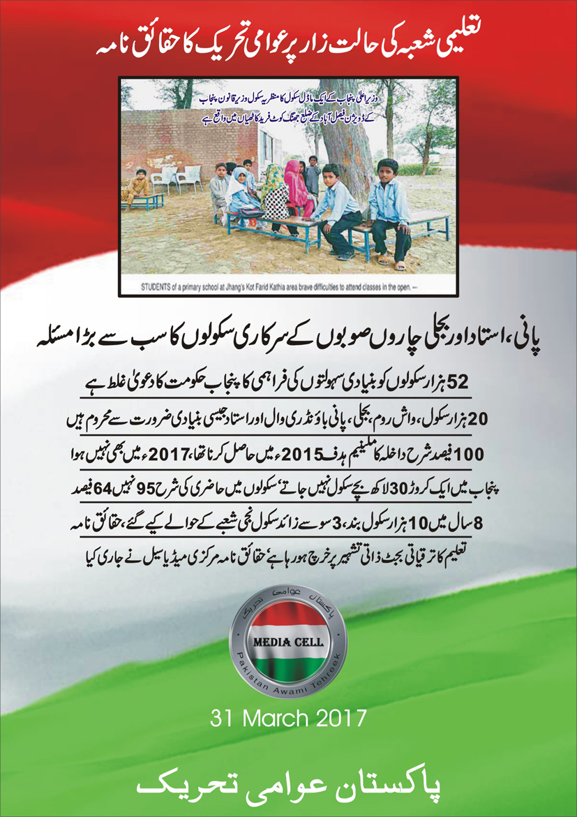 لاہور (31 مارچ 2017) پاکستان عوامی تحریک پنجاب کی طرف سے تعلیمی ترقی کے حوالے سے پنجاب حکومت کی طرف سے شائع شدہ اعداد و شمار کو چیلنج کرتے ہوئے حقائق نامہ جاری کیا گیا ہے جس میں کہا گیا ہے کہ وزیراعلیٰ پنجاب کی طرف سے 52 ہزار سکولوں میں بنیادی سہولیات کی فراہمی کا دعویٰ درست نہیں ہے۔ پنجاب کے 20 ہزار سکول، واش روم، بجلی، پانی باؤنڈری وال اور استاد جیسی بنیادی ضرورت سے محروم ہیں۔ 100 فیصد شرح داخلہ کا ملینیم ہدف 2015ء میں حاصل کرنا تھا، 2017ء میں بھی نہیں ہواجو حکومت کی تعلیم دشمنی اور گورننس کے محاذ پر بدترین ناکامی ہے۔ پنجاب میں ایک کروڑ 30 لاکھ بچے سکول نہیں جاتے، سکولوں میں حاضری کی شرح 95 نہیں 64 فیصد ہے۔ 8 سال میں 10 ہزار سکول بند، 3سو سے زائد سکول نجی شعبے کے حوالے کیے گئے، پنجاب حکومت کا دانش سکول، ماڈل سکول اور سکول آف ایکسی لینس منصوبہ بری طرح ناکام ہوا، تعلیم کا ترقیاتی بجٹ ذاتی تشہیر پر خرچ ہورہا ہے، ڈراپ آؤٹ ریٹ داخلوں سے زیادہ ہے، معیار تعلیم کو بہتر بنانے اور ٹیچرز ٹریننگ پروگرام پر فنڈز کا اجراء نہ ہونے کے برابر ہے۔