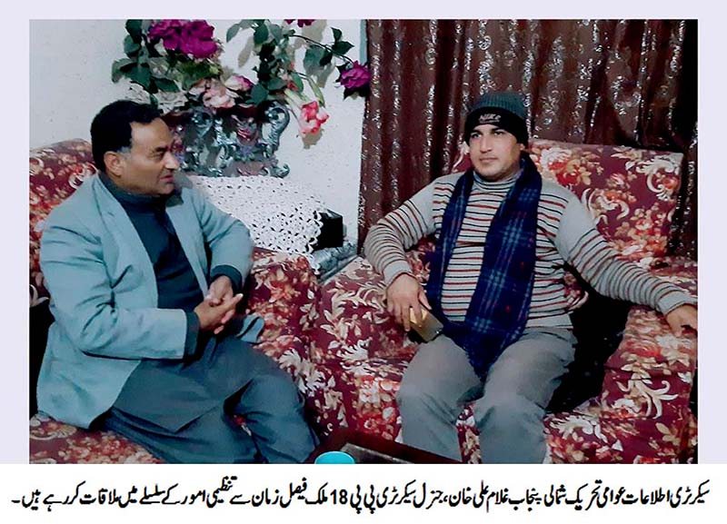 پاکستان عوامی تحریک شمالی پنجاب کے سیکرٹری اطلاعات غلام علی خان نے پاکستان عوامی تحریک اسلام آباد پی پی 18 کے جنرل سیکرٹری ملک فیصل زمان سے ملاقات کی۔ اس موقع پر دونوں رہنماوں نے پاکستان عوامی تحریک کے تنظیمی امور پر تبادلہ خیال کیا۔