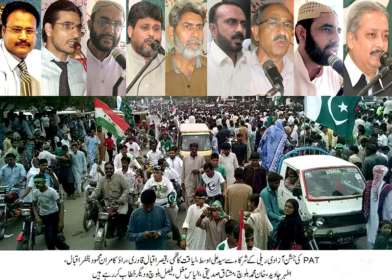 سید ظفر اقبال نے کہا نیشنل ایکشن پلان پر عمل ہوتا تو سانحہ ماڈل ٹاؤن کے قاتل پکڑے جاتے اور سانحہ کوئٹہ پیش نہ آتا۔ پڑوسی ملک ہمارے اندرونی معاملات میں مداخلت کر رہا ہے مگر ہمارے حکمران ان سے دوستیاں نبھا رہے ہیں۔ راؤ کامران محمود نے کہا جشن آزادی کے نعرے کے بعد حکمرانوں سے آزادی کا وقت آگیا ہے جب تک نواز شریف اقتدار میں ہے لوگ ایسے ہی مرتے رہیں گے اور انصاف کسی کو بھی نہیں ملے گا۔