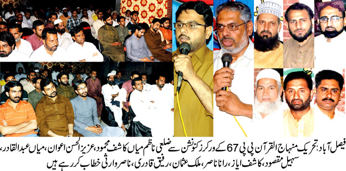 فیصل آباد (22 مئی 2015ء) تحریک منہاج القرآن کے ضلعی ناظم میاں کاشف محمود نے کہا ہے کہ ہمارے خدشات سچ ثابت ہوئے کہ موجودہ قاتل حکمرانوں کے ہوتے ہوئے ہمیں انصاف نہیں ملے گا۔ جے آئی ٹی نے سانحہ ماڈل ٹاؤن کے مظلوموں کو انصاف دلوانے کی بجائے قاتلوں کو تحفظ دیا۔ غیر ملکی سفارتکاروں، انسانی حقوق کی عالمی تنظیموں، یورپی یونین سمیت انصاف کے ہر فورم سے رجوع کرینگے۔ ان خیالات کا اظہار انہوں نے پی پی67 میں ورکرز کنونشن سے خطاب کرتے ہوئے کیا۔ اس موقع پرمیاں عبدالقادر، عزیزالحسن اعوان، رانا ناصر نوید، سہیل مقصود، کاشف ایاز، غلام محمد قادری، ملک عثمان، محمد ارشد اور ناصر وارثی بھی موجود تھے۔