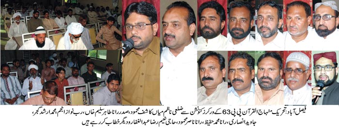 فیصل آباد(30 مئ 2015ء) تحریک منہاج القرآن پی پی 63 کے ورکرزکنونشن سے ضلعی ناظم میاں کاشف محمودنے خطاب کرتے ہوئے کہا کہ وی آئی پی اور صوابدیدی کلچر نے نظریہ پاکستان کو ناقابل تلافی نقصان پہنچایا۔ کرپٹ اور حادثاتی لیڈر شپ کی وجہ سے عوام کا جمہوریت اور ریاست سے رشتہ کمزور ہوا۔ ہم اس رشتے کو مضبوط بنانے کیلئے آخری حد تک جائینگے اور اس جدوجہد میں جان و مال کی قربانیاں کوئی بڑی بات نہیں ہو گی۔ ہم آنے والی نسلوں کیلئے ایک محفوظ اور خوشحال پاکستان کیلئے جدوجہد کر رہے ہیں۔ انقلاب کا سفر جاری ہے انقلاب کا یہ قافلہ خوشحالی اور نظام کی تبدیلی کی منزل تک پہنچ کر ہی دم لے گا۔اس موقع پررانا ناصر نوید، غلام محمد قادری، رانارب نوازانجم، صدر ارشدگجر، رانا حفیظ قادری، جاوید انصاری،عبدالغفار، حاجی نعیم رضا اور عرفان سلطانی بھی موجود تھے۔ پاکستان عوامی تحریک کے ضلعی صدر رانا طاہر سلیم نے کہا کہ ہماری منزل انقلاب ہے اور انقلاب کا قافلہ اپنی منزل کی طرف رواں دواں ہے اور لوٹ کھسوٹ کا نظام اپنے انجام کو پہنچے گا۔ بلدیاتی الیکشن میں حصہ لینے کیلئے بھرپور تیاریاں کی جائیں اور موثر انداز میں عوامی رابطہ مہم چلائی جائے۔ عوامی تحریک واحد جماعت ہے جو اختیارات اور وسائل کی مرکزیت کے خاتمہ اور منصفانہ تقسیم کا ویژن رکھتی ہے اور اس حوالے سے لوکل گورنمنٹ کے نظام کو بہترین ذریعہ سمجھتی ہے۔