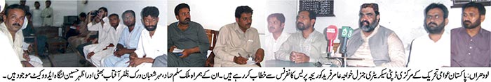 انہوں نے سانحہ ماڈل ٹاؤن کے حوالے ایک سوال کے جواب میں کہا کہ میاں نواز شریف اور میاں شہباز شریف اور ان کے درباری وزیر، مشیر 14 معصوم جانوں کے قاتل ہیں۔ قاتلوں کو کسی صورت معاف نہیں کریں گے، ان کا شرعی قانون کے مطابق قصاص لیا جائے گا۔ انہوں نے حلقہ 154 میں حصہ لینے کے حوالے سے کہا کہ آج لودھراں کے ہزاروں کارکنوں سے مشاورت ہوئی ہے جس میں انہوں نے اپنا فیصلہ سنادیا ہے تاہم حتمی فیصلہ قائدانقلاب ڈاکٹر محمد طاہرالقادری ہی کریں گے۔ بلدیاتی الیکشن میں پاکستان عوامی تحریک ہر سطح پر اپنے امیدوار سامنے لانے کی پوزیشن میں ہے، لیکن فیصلہ جات حکمت عملی کے تحت کئے جائیں گے۔ موجودہ سیاسی صورتحال پر انہوں کہا کہ قوم کا لوٹا ہوا ایک ایک پیسہ ذمہ داران سے واپس لینے، ملکی وسائل کو بے دردی سے لوٹنے والوں اور دہشت گردوں کے خلاف جاری آپریشن کے حق میں ہیں۔ اس موقع پر امیر تحریک منہاج القرآن راؤ محمد اسحاق خان، ضلعی صدر پاکستان عوامی تحریک مہر شعبان ورک، سیکرٹری جنرل ظفر آفتاب بھٹی، تحصیل سیکرٹری جنرل ملک اسلم حماد، ناظم ویلفیئر اظہر حسین لنگاہ ایڈووکیٹ، منظور خان بلوچ، یوسف چنڑ، مہر فدا حسین، ملک عابد نواز، یوتھ ونگ کے صدر ارشد علی مرزا، MSM کے ضلعی صدر ملک عمر فاروق، فوجی اعجاز احمد اور دیگر سینکڑوں کارکنان اور صحافیوں کی کثیر تعداد موجود تھی۔