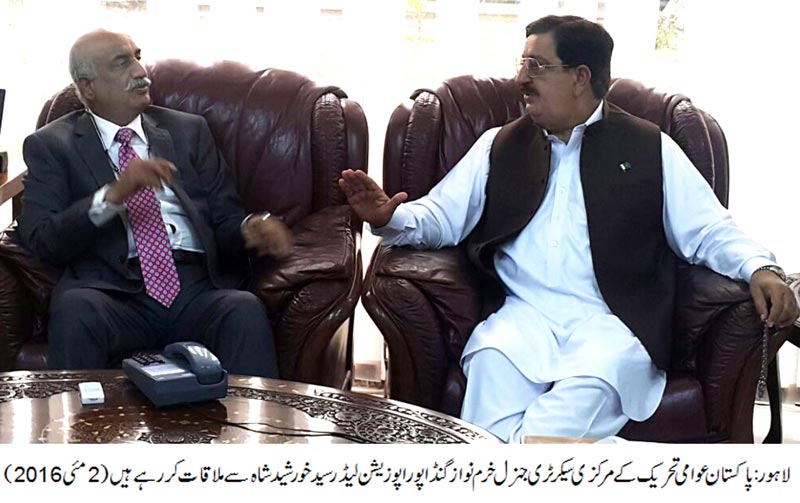 اسلام آباد/ لاہور (4 مئی 2016) پاکستان عوامی تحریک کے سیکرٹری جنرل خرم نواز گنڈاپور نے گزشتہ روز اپوزیشن لیڈر سید خورشید شاہ سے ان کی رہائش گاہ پر ملاقات کی اور سانحہ ماڈل ٹاؤن اور ملکی صورتحال کے حوالے سے تبادلہ خیال کی۔ خرم نواز گنڈاپور نے اپوزیشن لیڈر کو بتایا کہ ڈیڑھ سال سے سانحہ ماڈل ٹاؤن پر بننے والے جوڈیشل کمیشن کی رپورٹ شائع نہیں کی جارہی اور رپورٹ کی کاپی لینے کیلئے ہم لاہور ہائیکورٹ میں بیٹھے ہیں جبکہ دوسری طرف ہم نے انسداد دہشتگردی کی عدالت میں استغاثہ دائر کررکھا ہے۔ خرم نواز گنڈاپور نے بتایا کہ ہم شہدائے ماڈل ٹاؤن کے انصاف کیلئے ہر حد تک جائینگے۔ انہوں نے کہا کہ پارلیمانی جماعتیں بھی انسانی حقوق کی اس سنگین خلاف ورزی کی آواز پارلیمنٹ کے اندر اٹھائیں۔ اپوزیشن لیڈر نے کہاکہ 17 جون 2014 ء کے دن جو کچھ لاہور ماڈل ٹاؤن میں ہوا وہ قابل مذمت اور قابل گرفت ہے۔ یہ بات تکلیف دہ ہے کہ دو سال گزر جانے کے بعد بھی سانحہ ماڈل ٹاؤن میں جاں بحق ہونے والوں کو انصاف نہیں مل۔ انہوں نے کہا کہ پاکستان ایک جمہوری ملک ہے اس میں اس طرح شہریوں کی جانیں لینے والوں کو کسی صورت برداشت نہیں کیا جاسکت۔ وزیراعلیٰ پنجاب کی یہ ذمہ داری تھی کہ وہ 14 بے گناہوں کی اموات کے ذمہ داروں کا تعین کرتے اور انہیں سزائیں دلواتے۔ انہوں نے کہا کہ ہم شہدائے ماڈل ٹاؤن کے ساتھ ہیں۔ پاکستان پیپلز پارٹی نے ایسی بربریت کی نا کبھی پہلے حمایت کی نہ آئندہ کرے گی۔ انہوں نے کہا کہ جسٹس باقر علی نجفی جوڈیشل کمیشن کی رپورٹ منظر عام پر آنی چاہیے۔